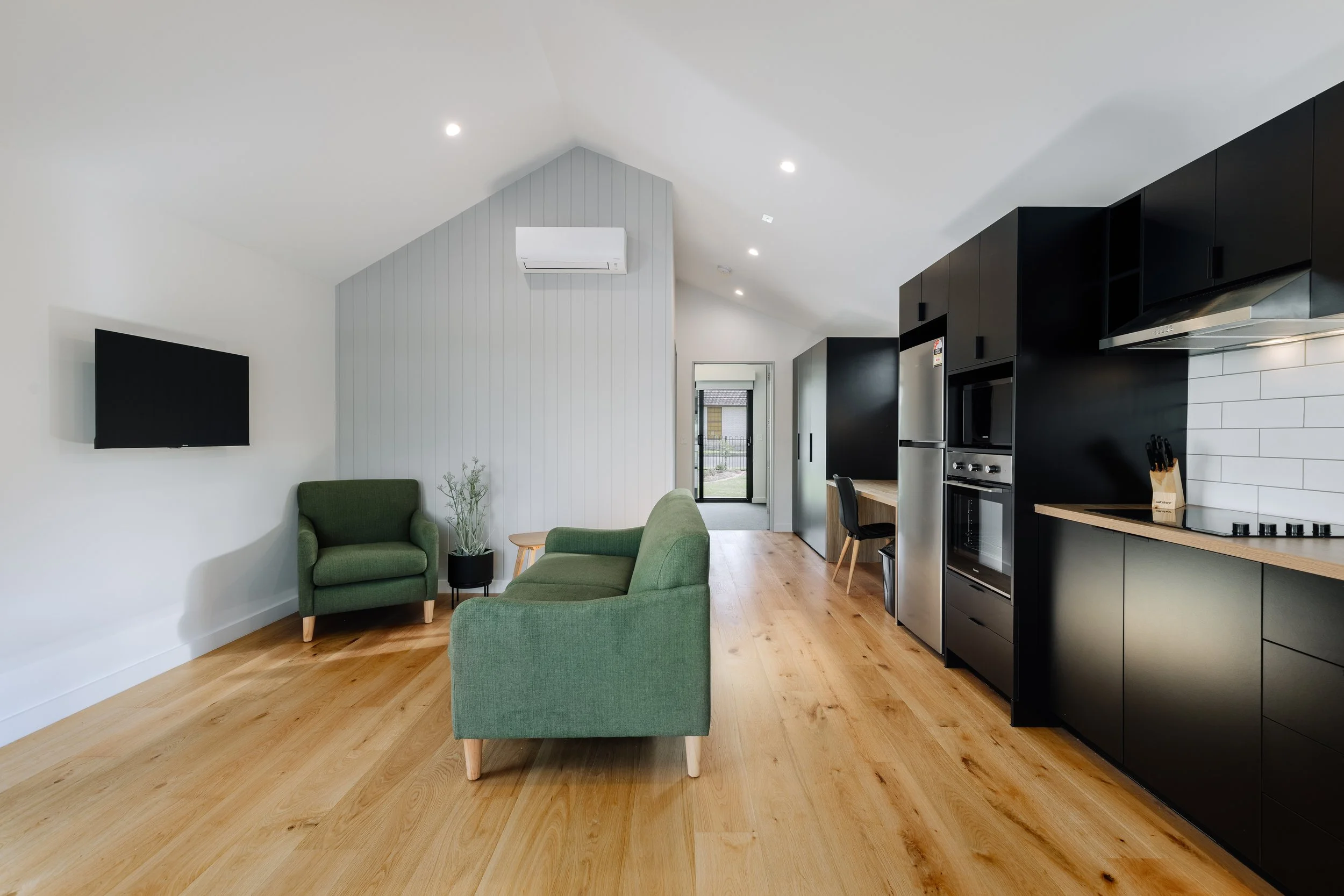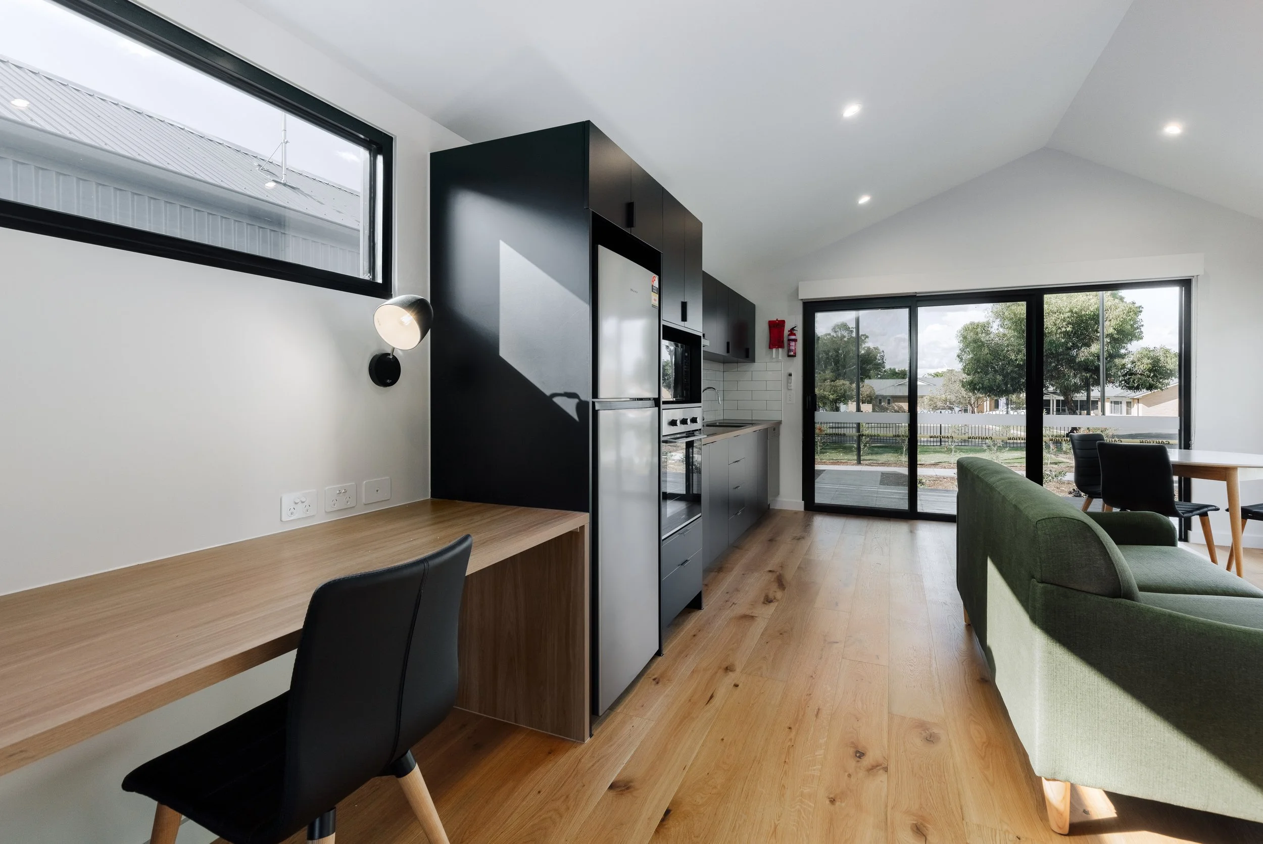 This project was a rollout of new accommodation for travelling doctors in rural hospital locations. This took the form of a single module building that contained a bedroom, bathroom, open plan living, dining and kitchen. I utilised efficiencies of modular construction which allowed the building to be completed in its entirety prior to transportation to their sites. My involvement spanned the entire length of the project, from concept development through client engagement, documentation and construction coordination.This project looked to utilise a tight budget while still offering a comfortable and inviting environment for travelling medical professionals.